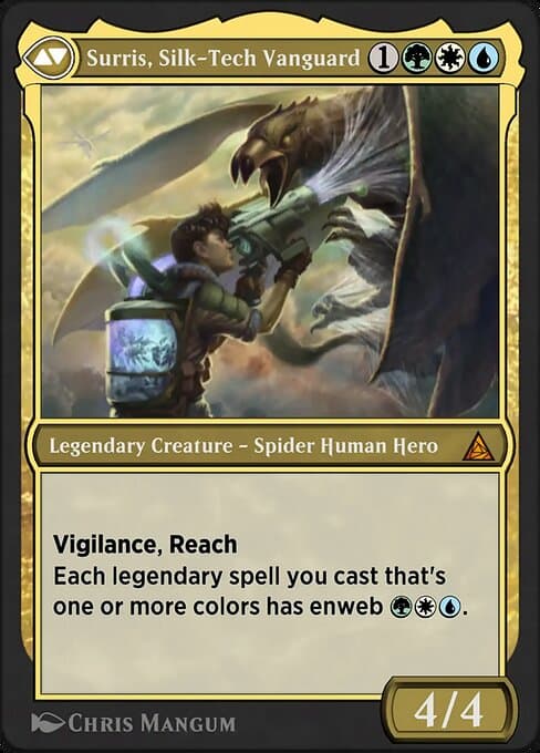 Each legendary spell you cast that's one or more colors has web-slinging {G}{W}{U}. (You may cast a spell for its web-slinging cost if you also return a tapped creature you control to its owner's hand.)