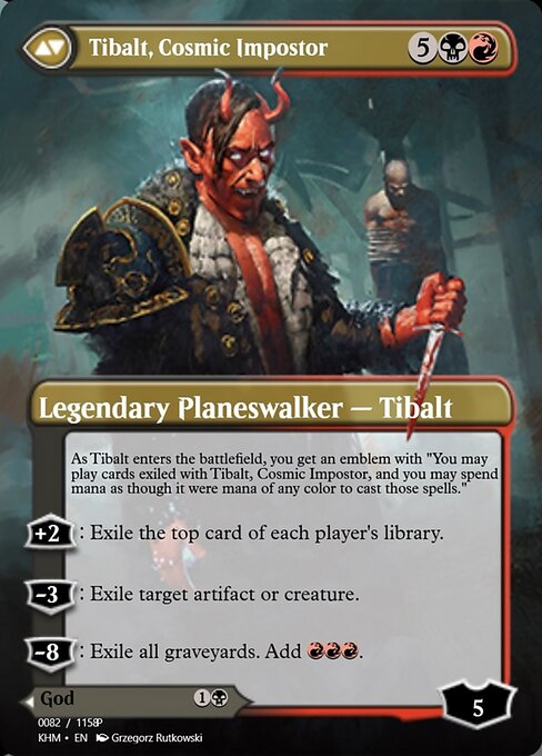 As Tibalt enters, you get an emblem with "You may play cards exiled with Tibalt, Cosmic Impostor, and you may spend mana as though it were mana of any color to cast those spells."
