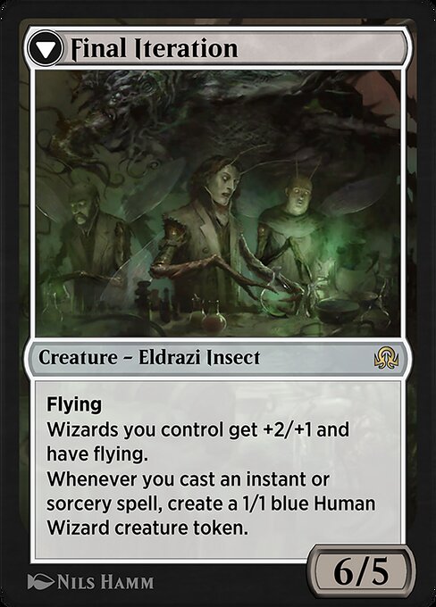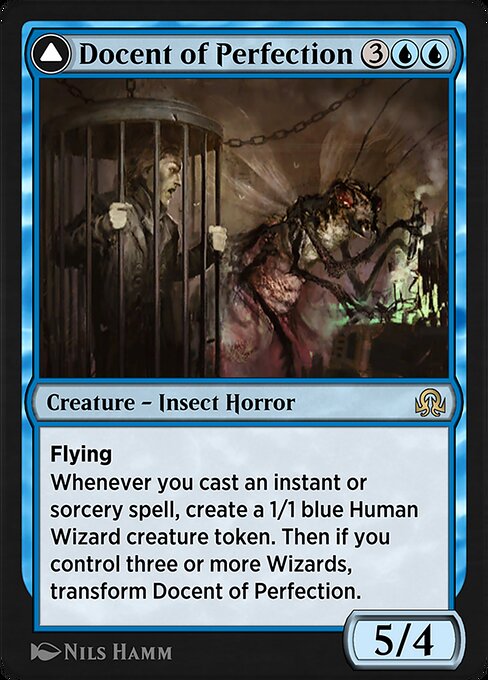 Whenever you cast an instant or sorcery spell, create a 1/1 blue Human Wizard creature token. Then if you control three or more Wizards, transform this creature.