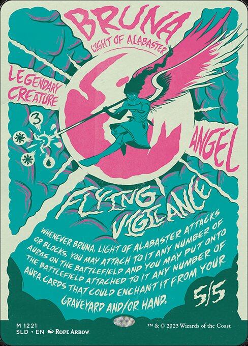 Whenever Bruna attacks or blocks, you may attach to it any number of Auras on the battlefield and you may put onto the battlefield attached to it any number of Aura cards that could enchant it from your graveyard and/or hand.