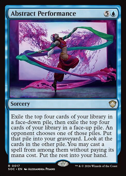 Exile the top four cards of your library in a face-down pile, then exile the top four cards of your library in a face-up pile. An opponent chooses one of those piles. Put that pile into your graveyard. Look at the cards in the other pile. You may cast a spell from among them without paying its mana cost. Put the rest into your hand.