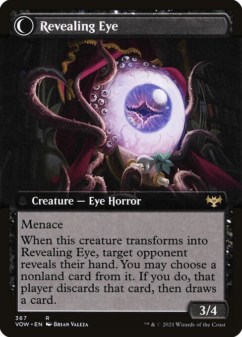 When this creature transforms into Revealing Eye, target opponent reveals their hand. You may choose a nonland card from it. If you do, that player discards that card, then draws a card.